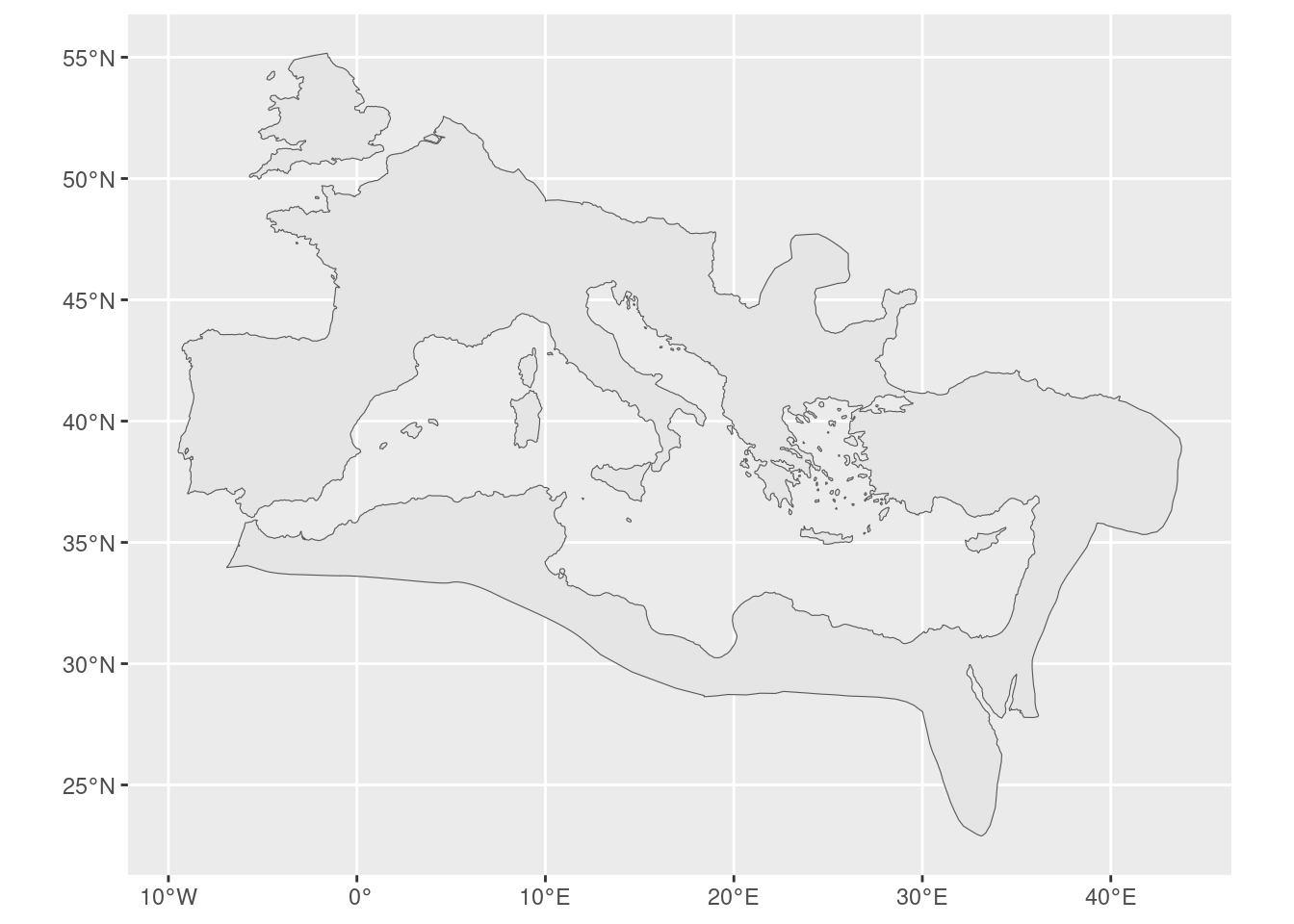 First, we extract the outer boundary of all neighbourhoods classified as inside the Roman Empire. Then we define a small polygon covering the relevant area and use st_intersection() to clip the border to that region.