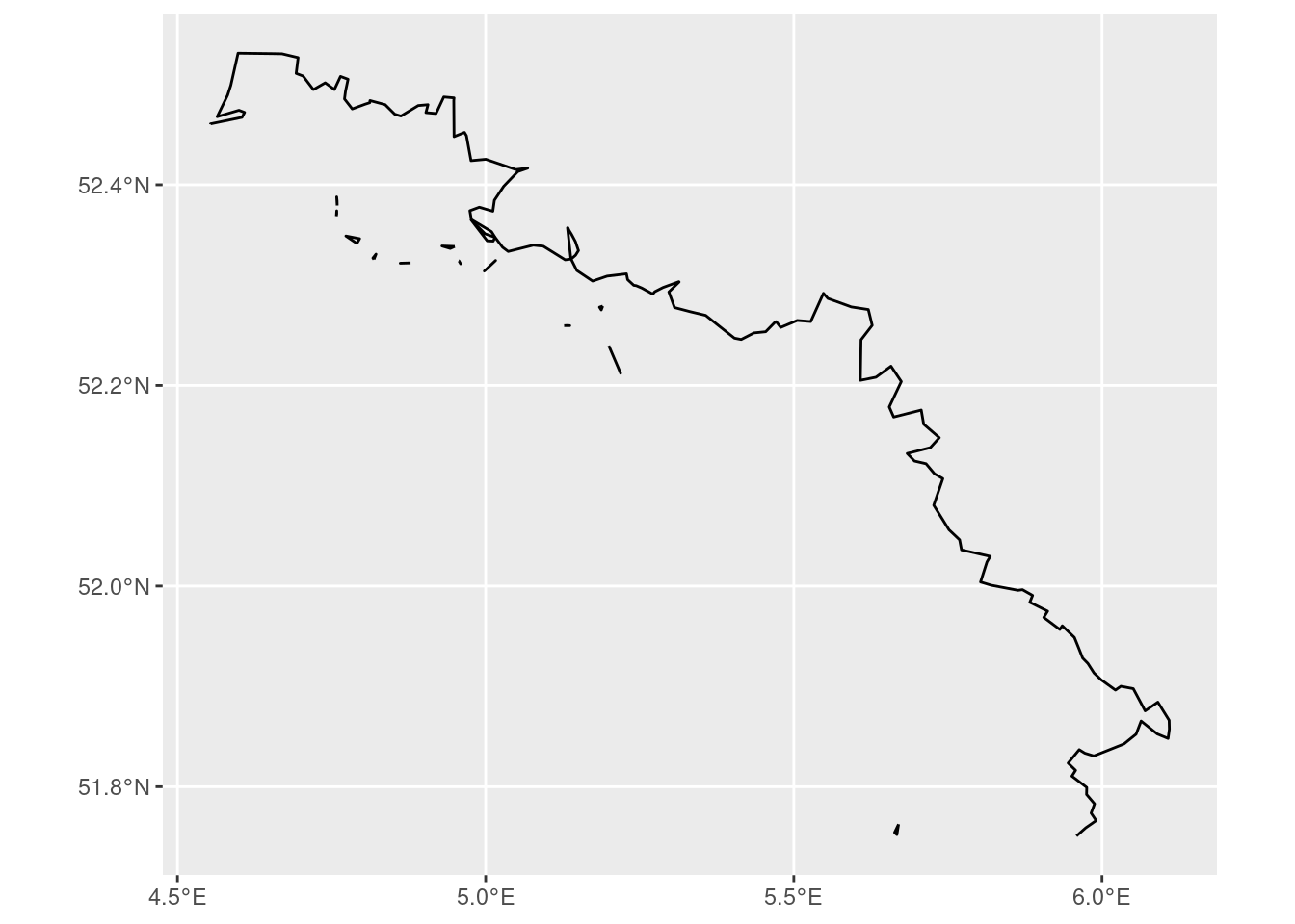 # Dissolve all "inside" neighbourhoods and extract their outer boundaryboundary <- wijk |>filter(in_roman_empire ==1) |>st_union() |>st_boundary()# Define a polygon covering the Dutch section of the Roman borderpoint1 <-c(4.5, 52.5)point2 <-c(4.5, 53)point3 <-c(6.4, 53)point4 <-c(6.4, 51.75)point5 <-c(5.5, 51.75)point6 <-c(4.5, 52.5)coords <-list(rbind(point1, point2, point3, point4, point5, point6))poly_coords <-st_polygon(coords)poly_c <-st_sfc(poly_coords, crs =st_crs(crs))poly_l <-st_sf(poly_c) |>rename(geometry = poly_c)# Clip the boundary to this regionborder <-st_intersection(boundary, poly_l)border |>ggplot() +geom_sf()