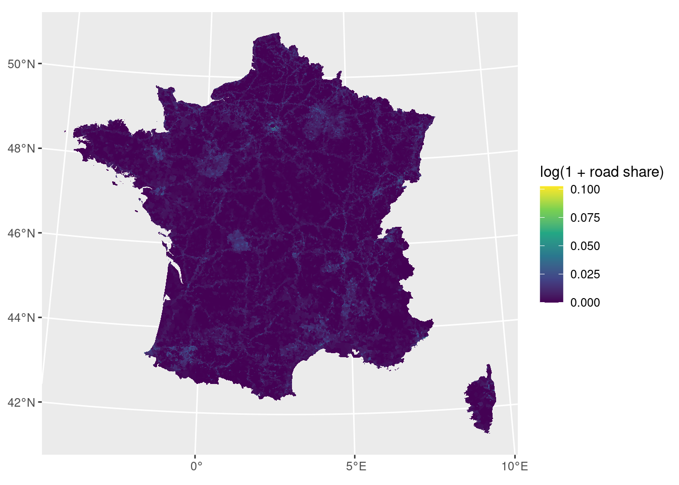 We map the log-transformed road surface share. log(1 + sufrace) compresses the right tail so that the colour scale is not dominated by a few highly urbanised communes.