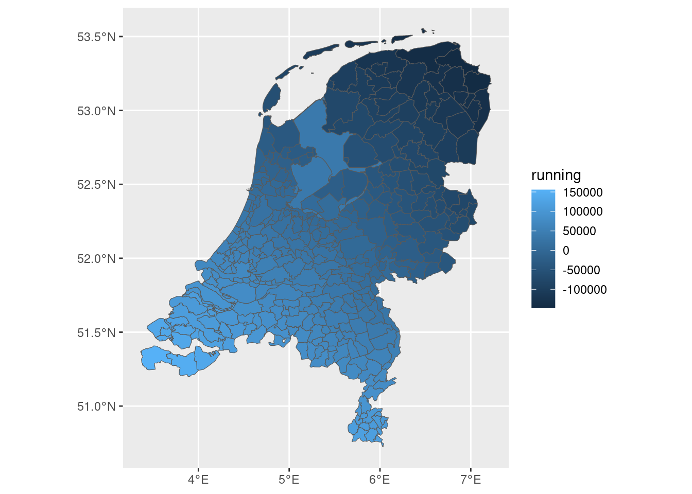 We can map the running variable to confirm it looks right — positive values should appear in the south of the Netherlands (inside the empire) and negative in the north: