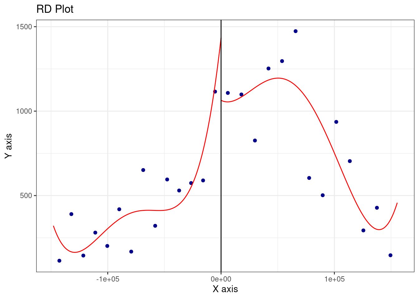 library(rdrobust)rdrobust::rdplot(y = data$density, x = data$running, c =0)