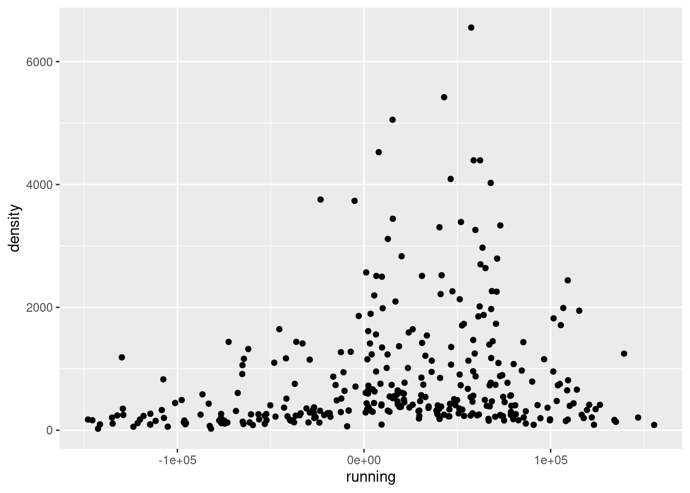 data |>ggplot(aes(x = running, y = density)) +geom_point()