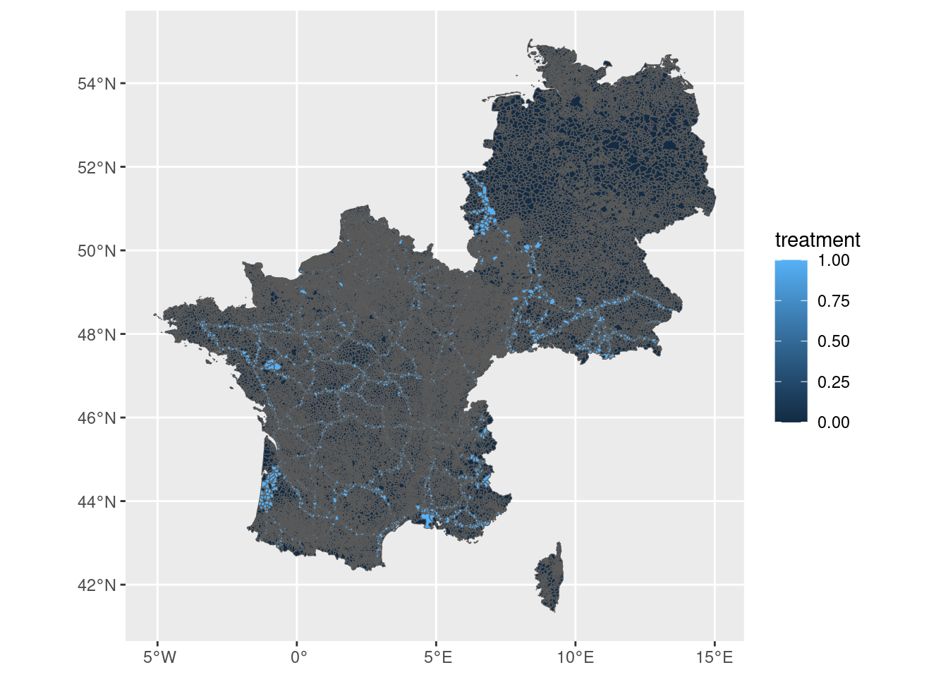 We read in the France-Germany shapefile. Each row is a LAU region with spatial geometry, a treatment indicator (treatment), and population density (POP_DENS_2016).